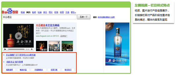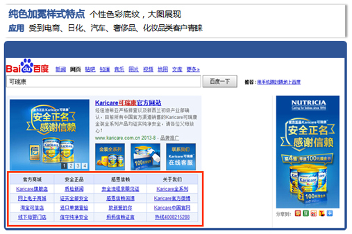 1. 黄金首屏位置,减少搜索流失。2. 树立品牌形象 ,建立企业重要沟通渠道。3. 浓缩官网精华内容,提供便捷的销售通路。标准样式